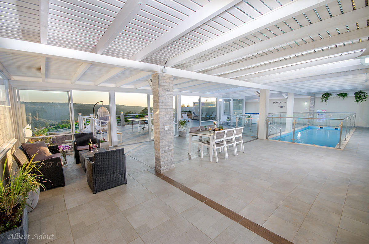 החצר כולה פונה לטבע ולנוף פסטורלי, בה תהנו ממגוון פינות ישיבה מוצלות ומריהוט גן איכותי, שולחן פינג פונג, ברביקיו ותאורה לשעות הערב, ג'קוזי ספא ובריכת שחייה מגודרת מפנקת במיוחד (מקורה ומחוממת בחורף).